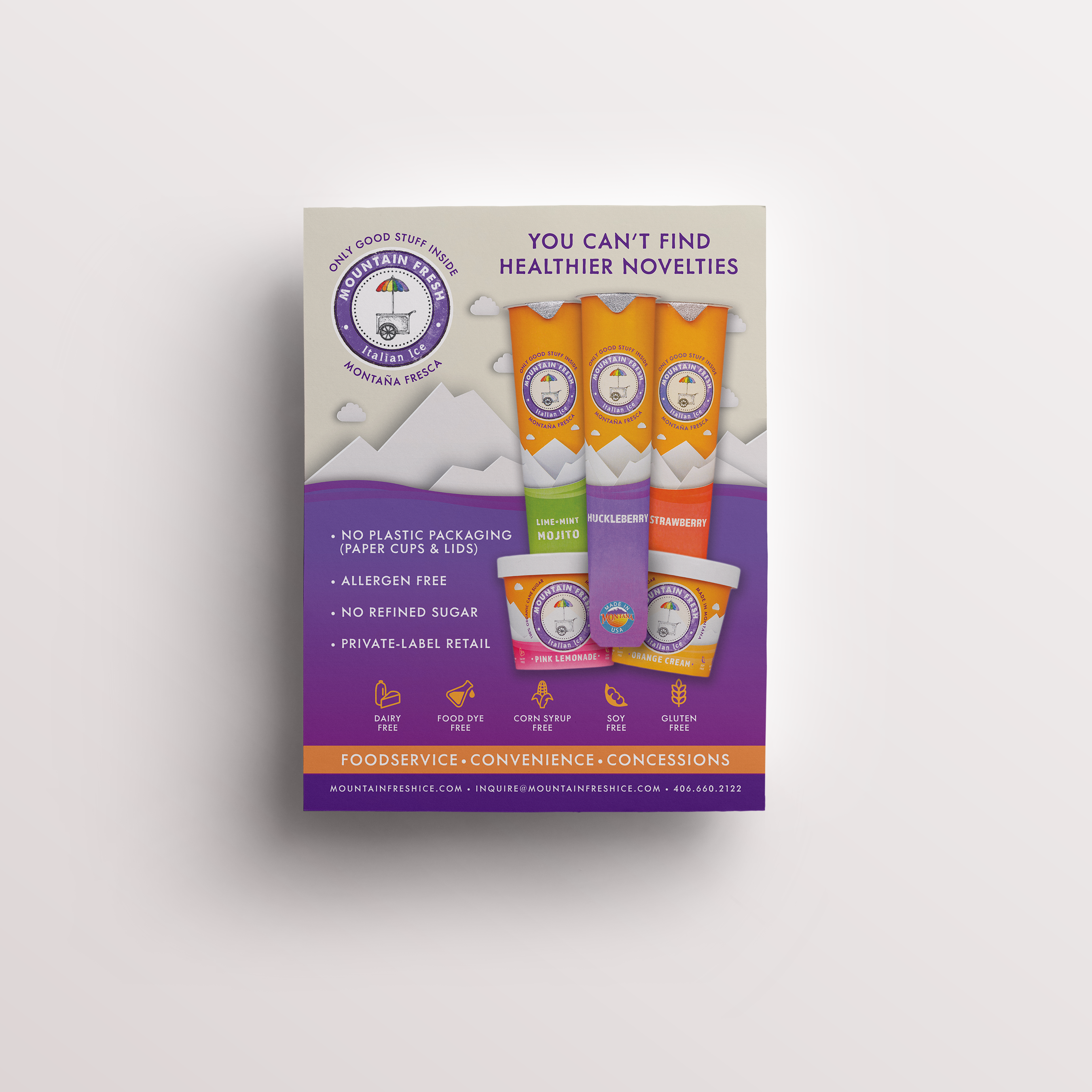 In collaboration with Mountain Fresh Italian Ice, I was tasked with the opportunity to craft a comprehensive collection of marketing materials that would align with their brand identity and effectively communicate their unique offerings. The project encompassed the creation of a sell sheet, designed to showcase the clean ingredients in their products. Additionally, I crafted visually striking trade show banners that combined aesthetic appeal with informational clarity. Lastly, a brand round was developed, providing a comprehensive overview of the products.