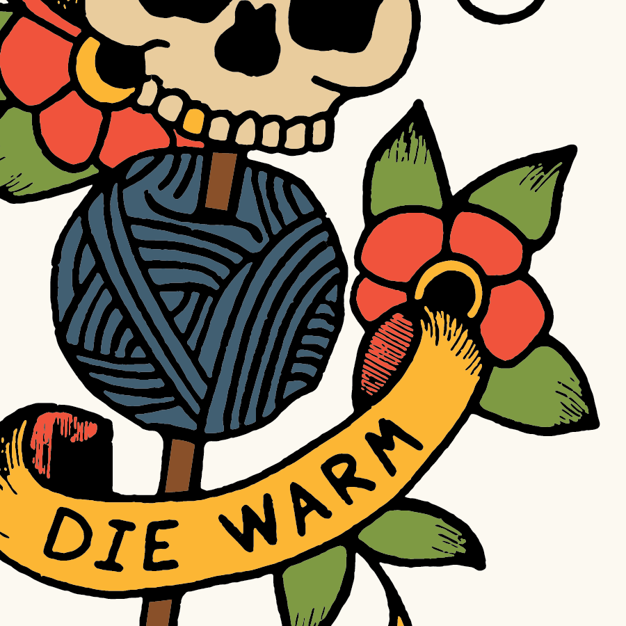 In the creation of the "Knit Fast, Die Warm" design, my inspiration was to impose a punk aesthetic into the traditionally serene and cozy world of knitting. I sought to challenge the stereotypes associated with the craft and create a design that resonates with individuals seeking an unconventional expression of their passion for knitting. The juxtaposition of the classic "Live Fast, Die Young" phrase with the comforting act of knitting adds a sense of humor and attitude to the design. This campaign aims to break free from the conventional norms of the knitting community, offering a fresh perspective and encouraging individuals to embrace the rebellious spirit within their creative pursuits.